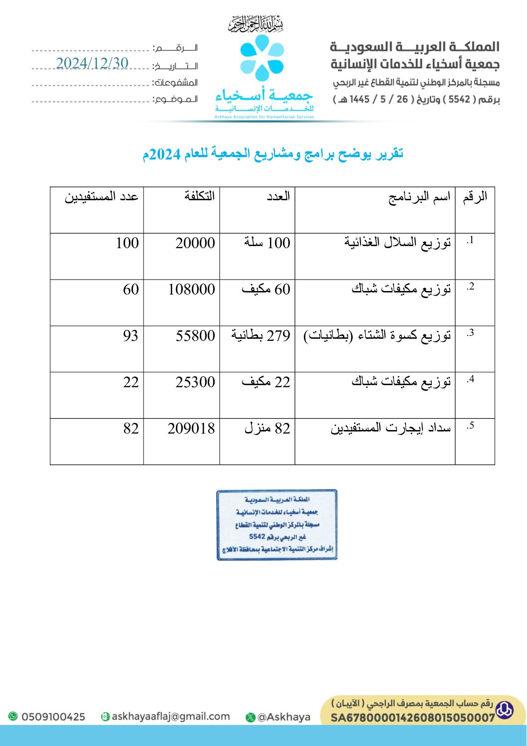 خلال عقد اجتماع مجلس إدارة جمعية أسخياء للخدمات الإنسانية بالأفلاج رقم (2) للعام 2025م، يوم الإثنين بتاريخ:8/10/1446هـ الموافق:7/04/2025م تمت مناقشة آراء استبانة أصحاب العلاقة و المستفيدين من برامج الجمعية وخدماتها خلال العام 2024.